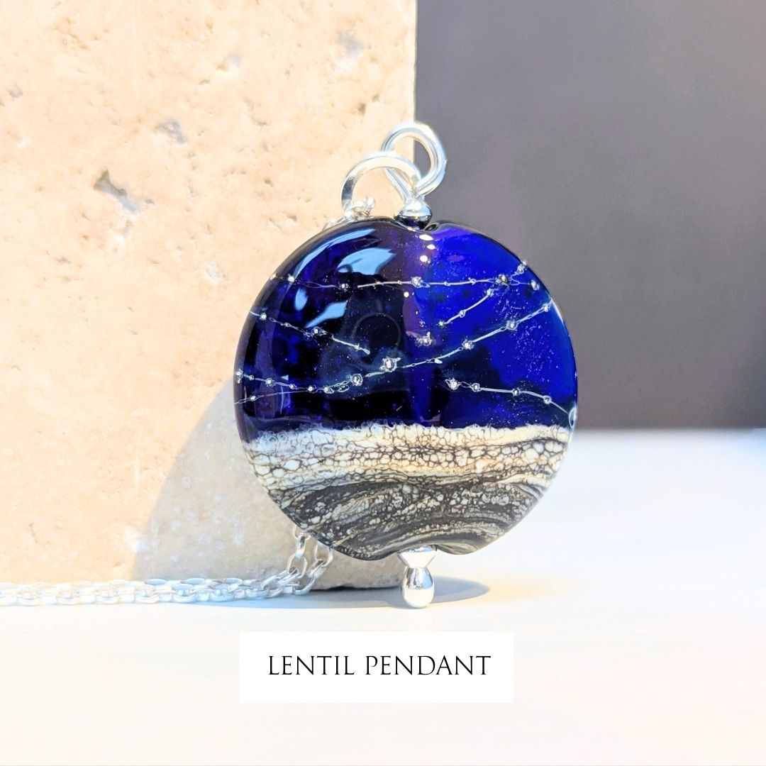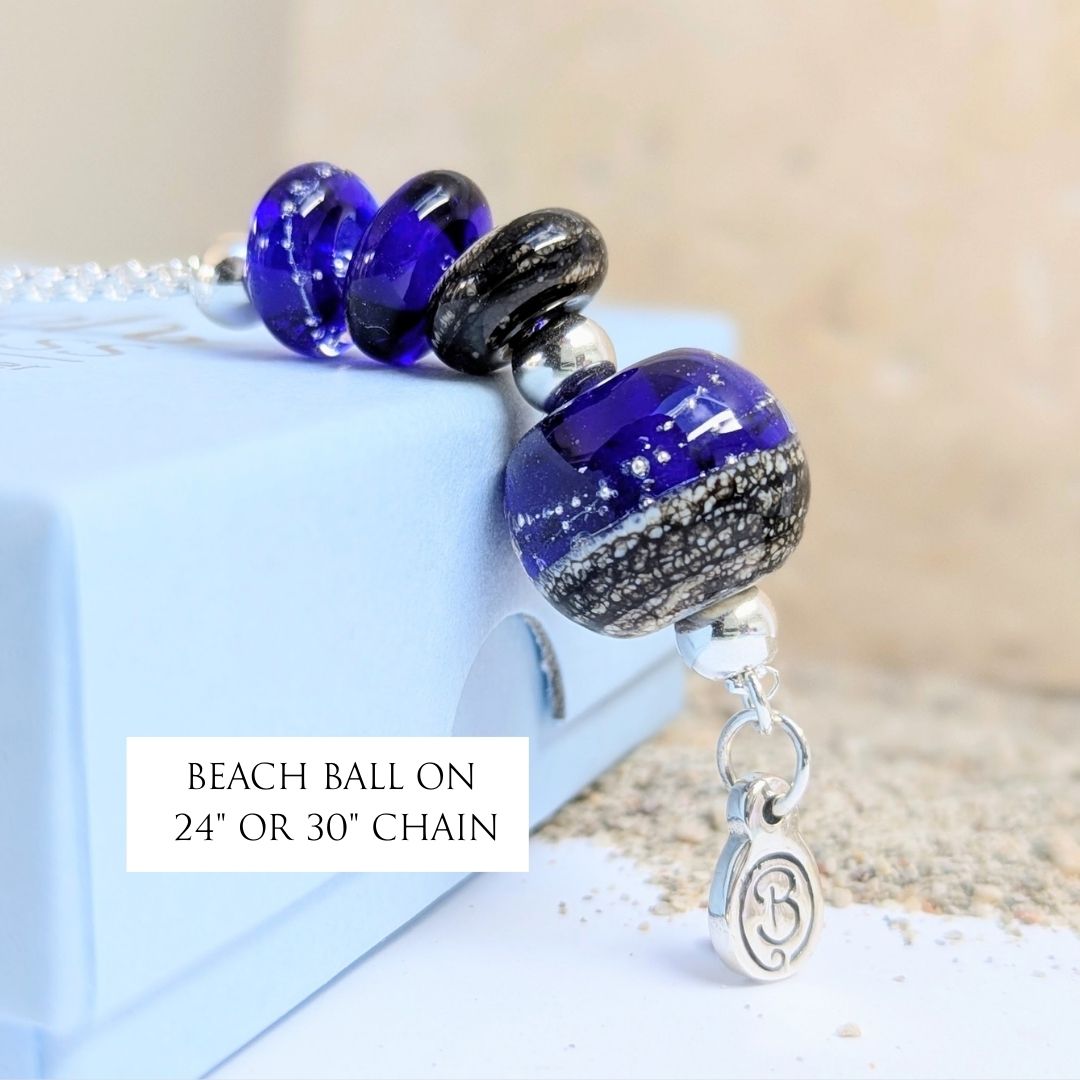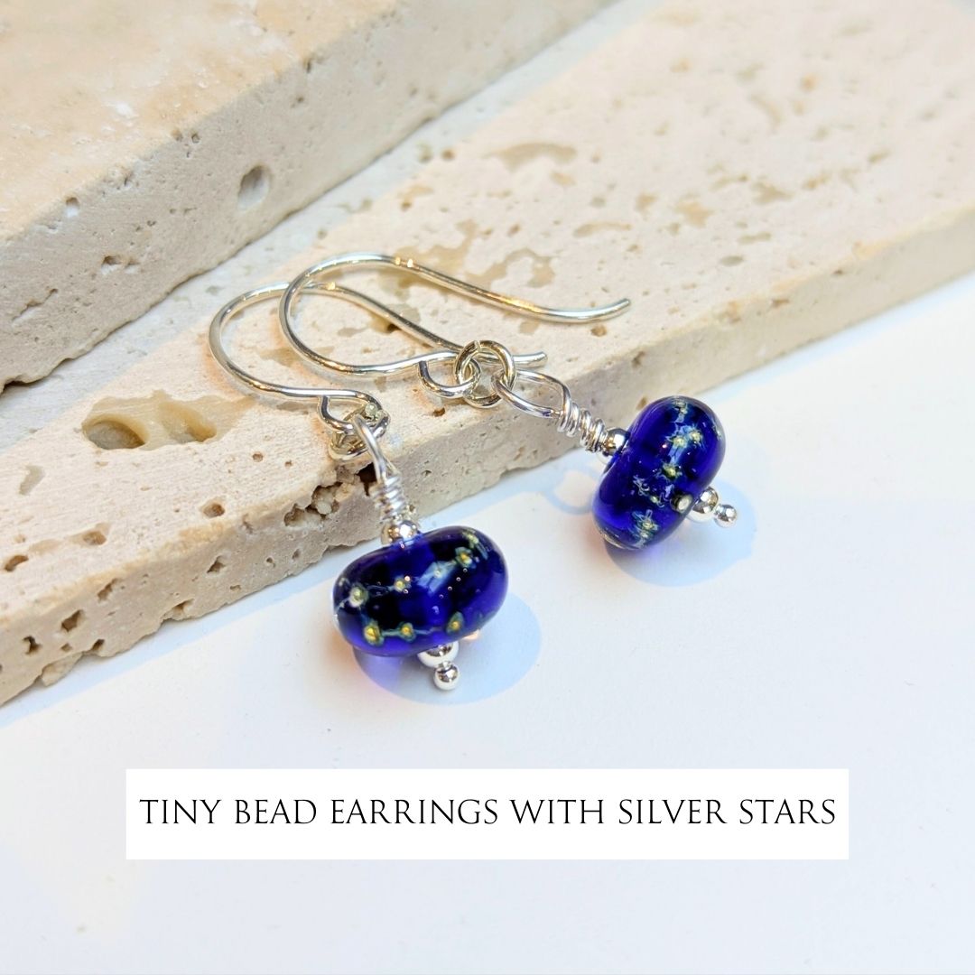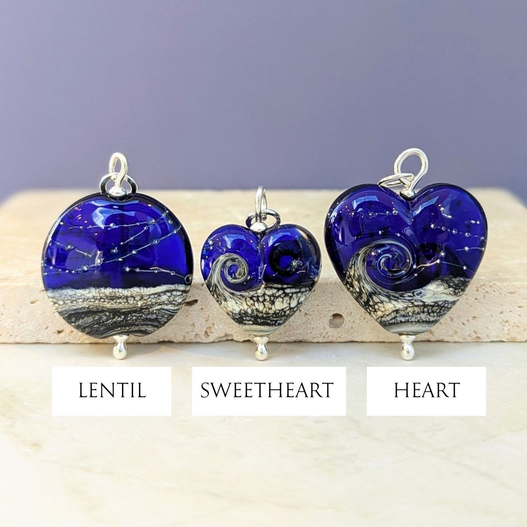 Each bead is handmade in deep cobalt glass, scattered with tiny stars of fine silver and finished with a golden touch of beach around the base. A design to remind you of those unforgettable summer nights by the sea, or maybe to inspire your bucket list.