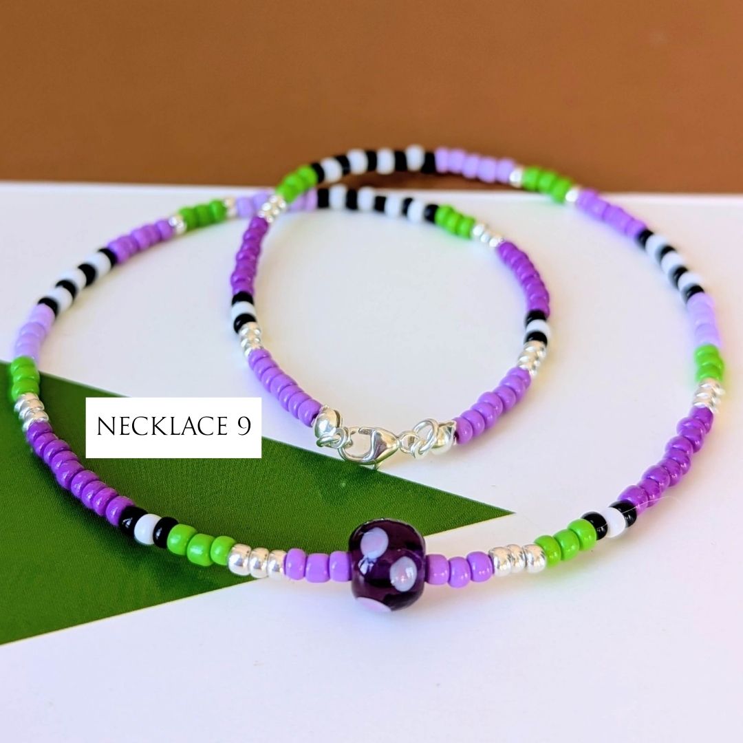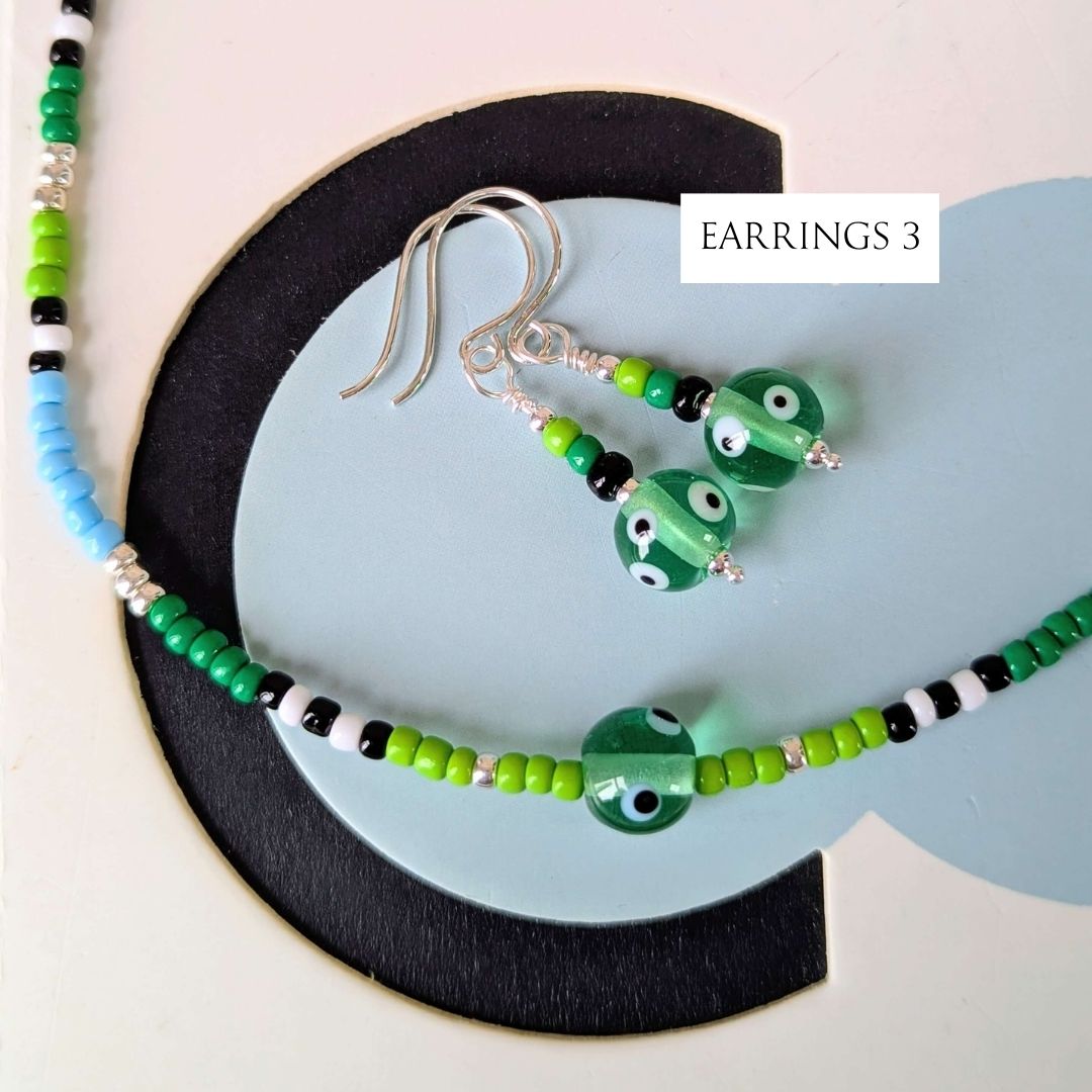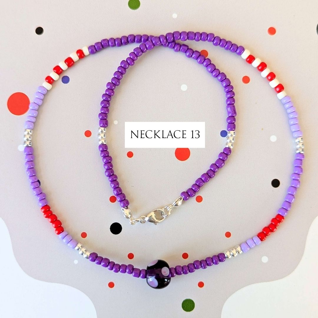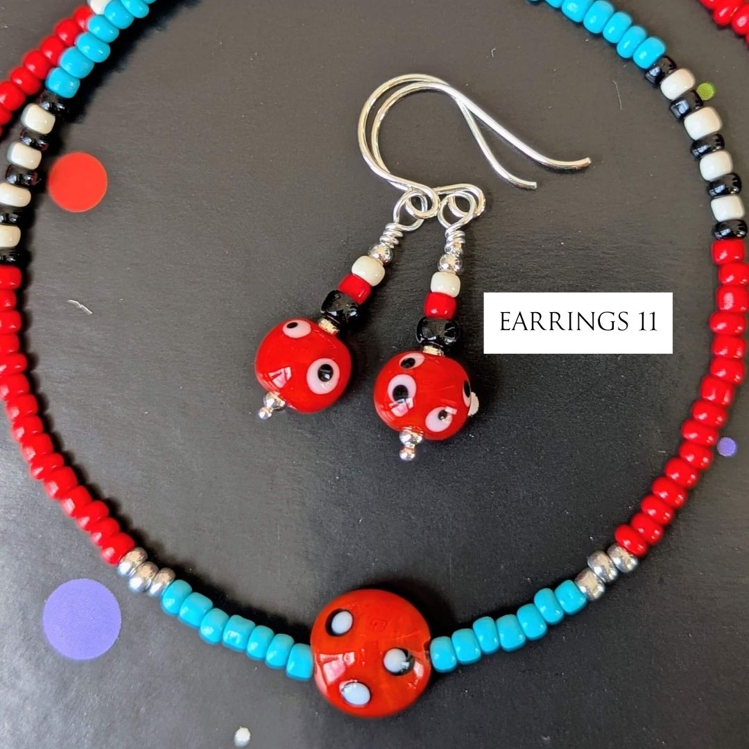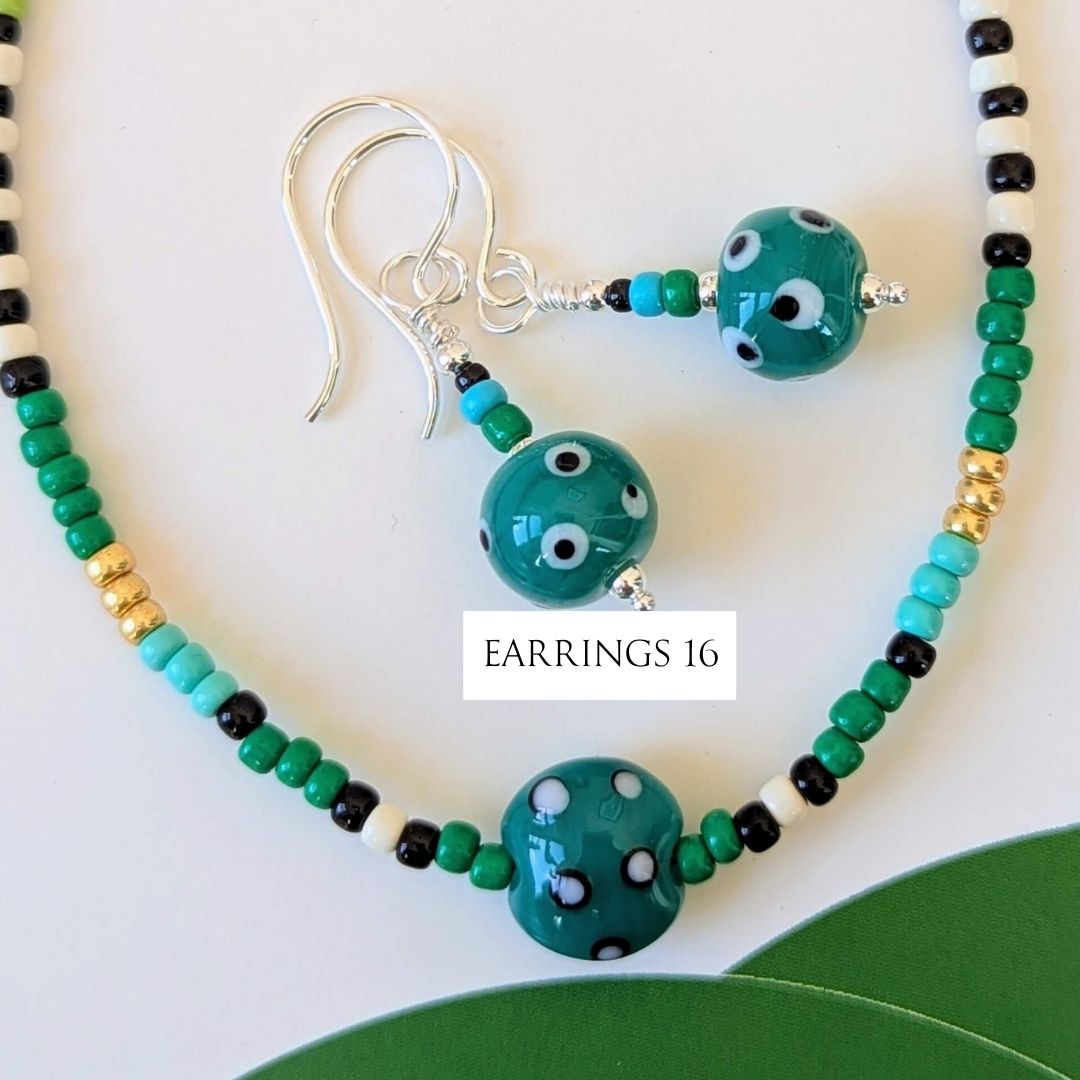 Most necklaces have matching Spotlight Earrings, made with the same design of lampwork bead and a few coordinating seed beads, finished with handmade sterling silver ear wires. If matching earrings aren’t shown for your chosen necklace (apart from No. 10), I’ll be making them to order.