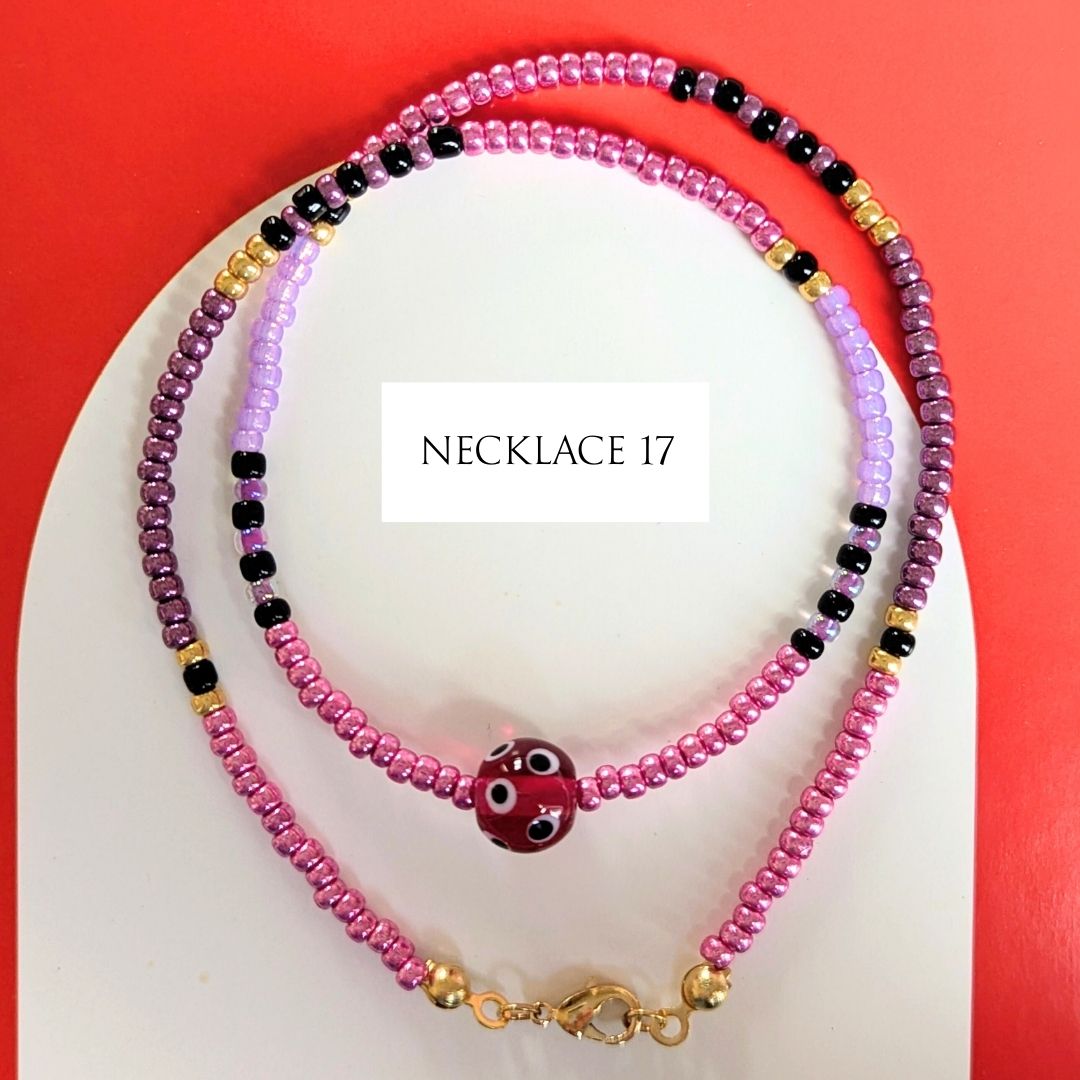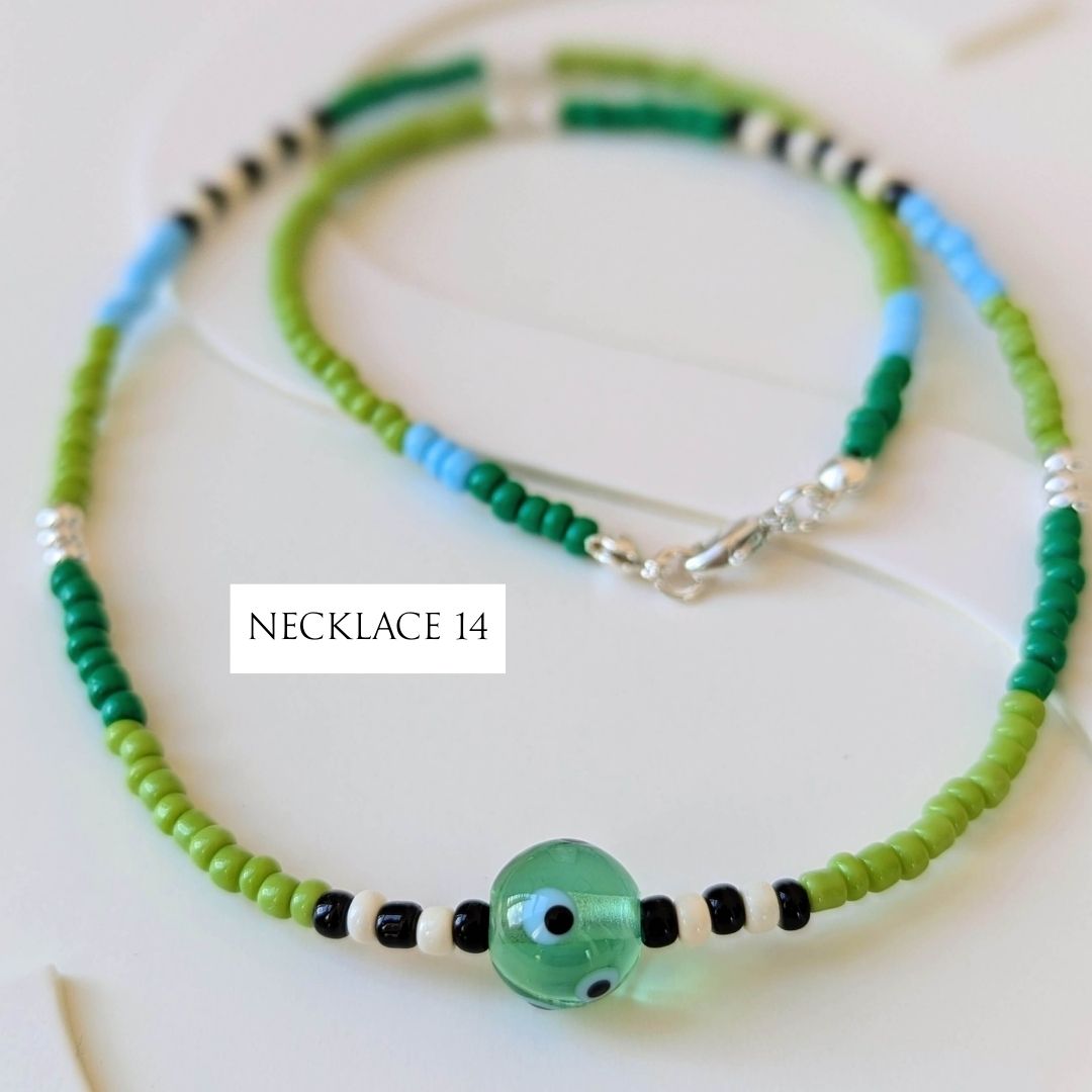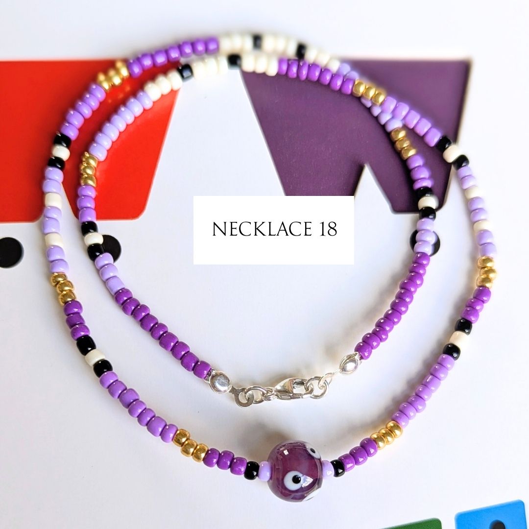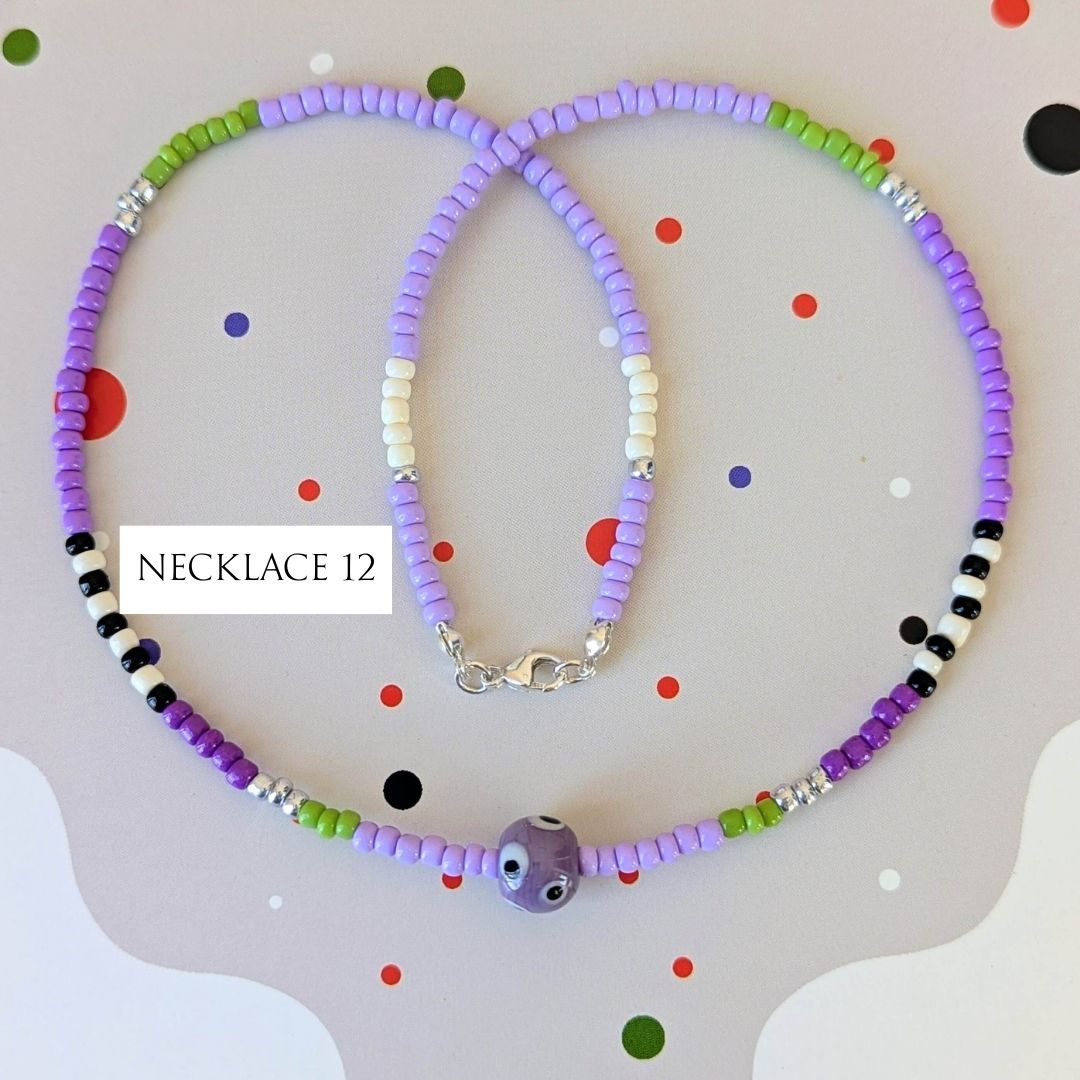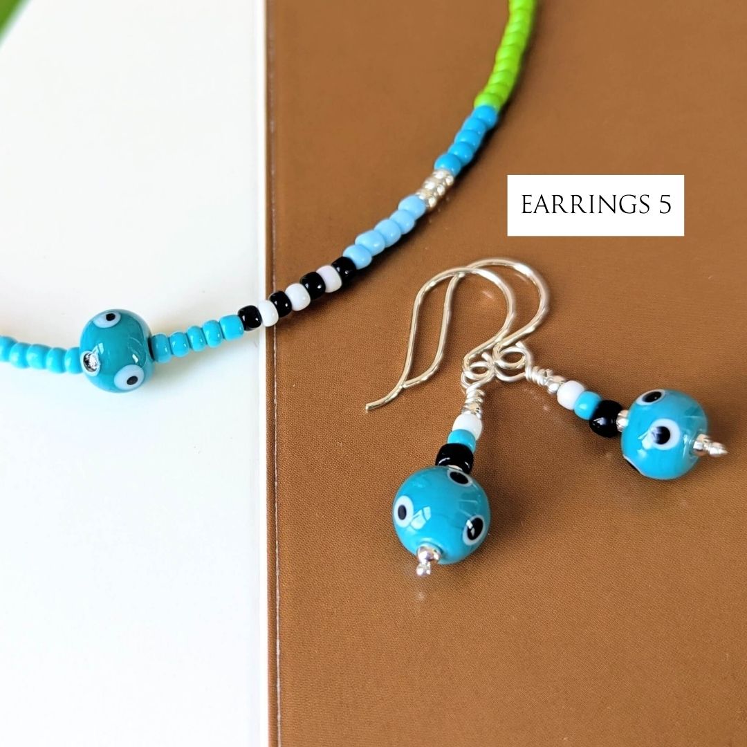 Most necklaces have matching Spotlight Earrings, made with the same design of lampwork bead and a few coordinating seed beads, finished with handmade sterling silver ear wires. If matching earrings aren’t shown for your chosen necklace (apart from No. 10), I’ll be making them to order.