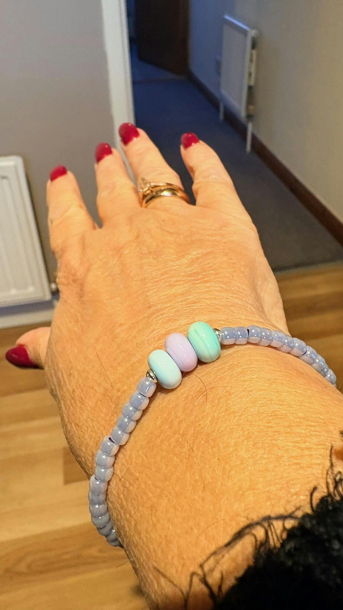This sweet bracelet features 3 handmade glass beads in my Coastal Path lavender, green and blue colours and a bunch of toning Japanese seed beads. Choose to have a sterling silver toggle, magnetic clasp, or no clasp at all (easy to wear stretch bracelet). I thread these bracelets on elastic so the size is a little more forgiving and there’s no sharp end of thread poking out and scratching you.