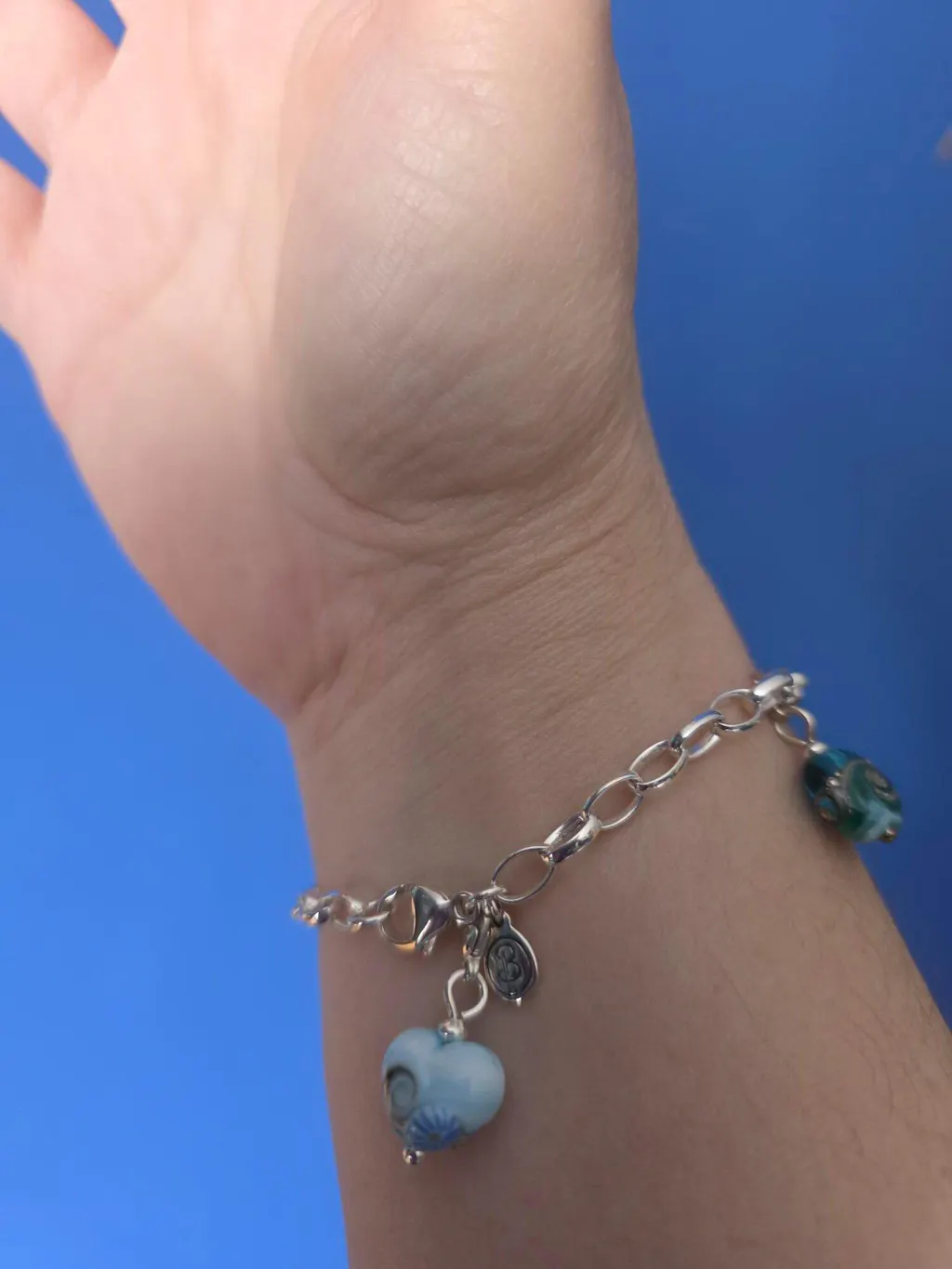The bracelet is supplied with a single glass charm, fastened to the bracelet with a tiny silver clasp. Make your choice from 24 charm options. If you choose a Coastal Path charm you need to let me know your colour choice, you can see them all here.