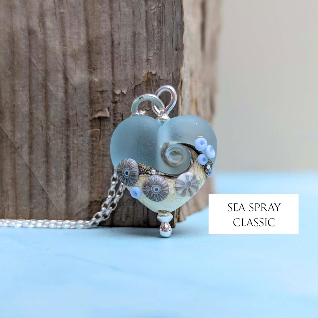 I decorate the bead on both sides and make it in 2 styles. The Classic is half sand and half pale blue with all my beachy details. The Simple version is paired back with a wave and fewer details. The shiny dots are 99% pure fine silver, melted into the surface of the glass.